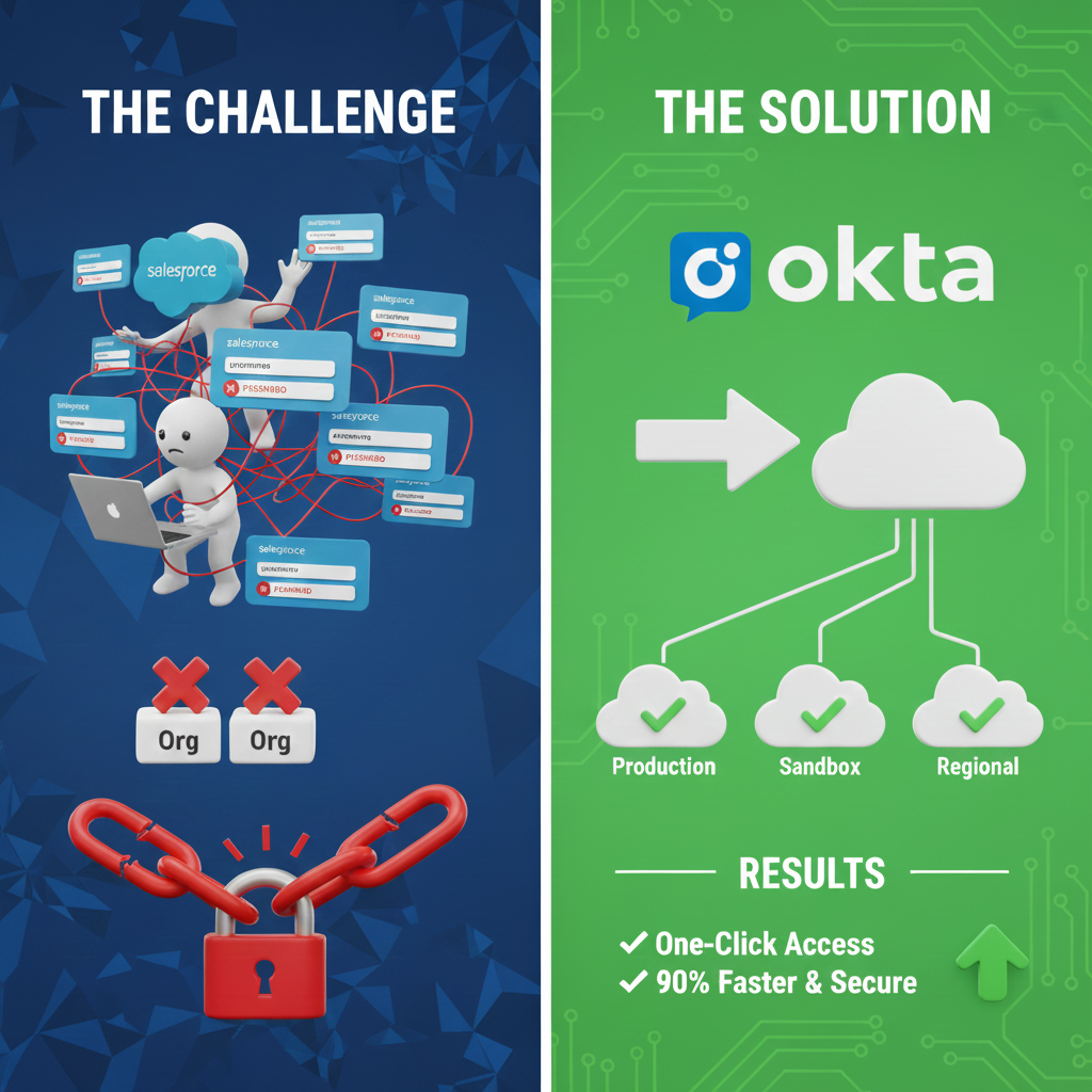Before implementing a unified SSO solution using Okta and Salesforce, our internal teams faced significant friction, security risks, and high administrative overhead due to a fragmented login environment across our multiple Salesforce Orgs (e.g., Production, various Sandboxes, regional instances).